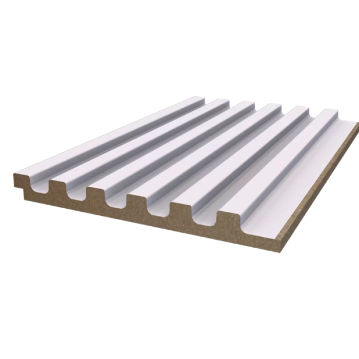 Реечная панель WellMaker ПН-38 МДФ Белабел размером 2800x123x12 мм — стильное решение для отделки жилых и гостевых комнат в Минске. Панель изготовлена из МДФ с гладкой матовой поверхностью белого цвета, без рисунка, имитирует древесину.